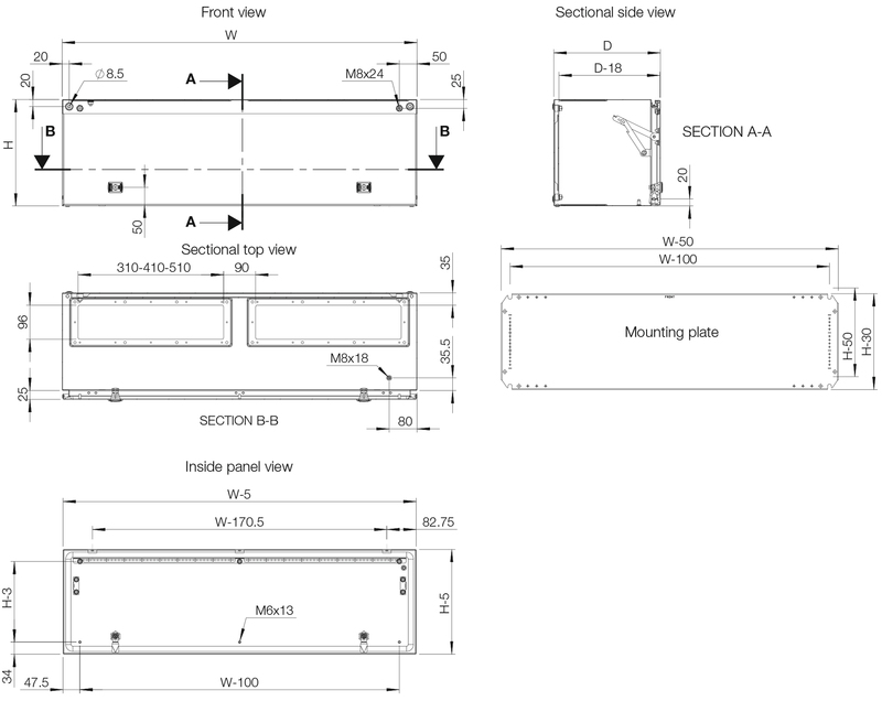 - Öffnungen für Flanschplatten (2x oben und 2x unten), Flanschplatten & Flanschdichtungen Typ 3 nicht im Lieferumfang enthalten(wenn das MAP Paneel mit einem MAS oder MAD Gehäuse kombiniert werden soll, kann die Flanschplatte des MAS / MAD Gehäuses mit dem MAP Paneel verwendet werden)
